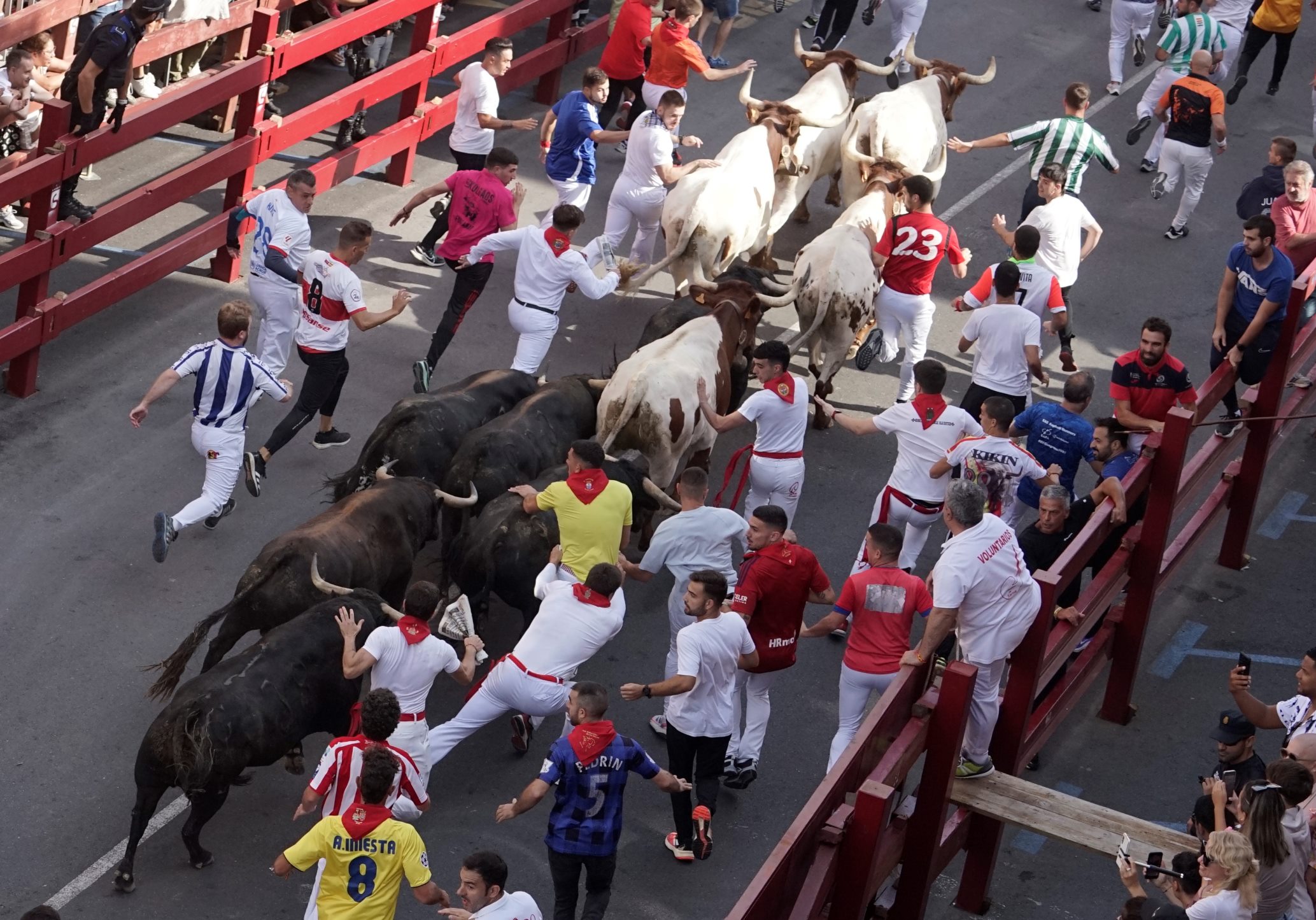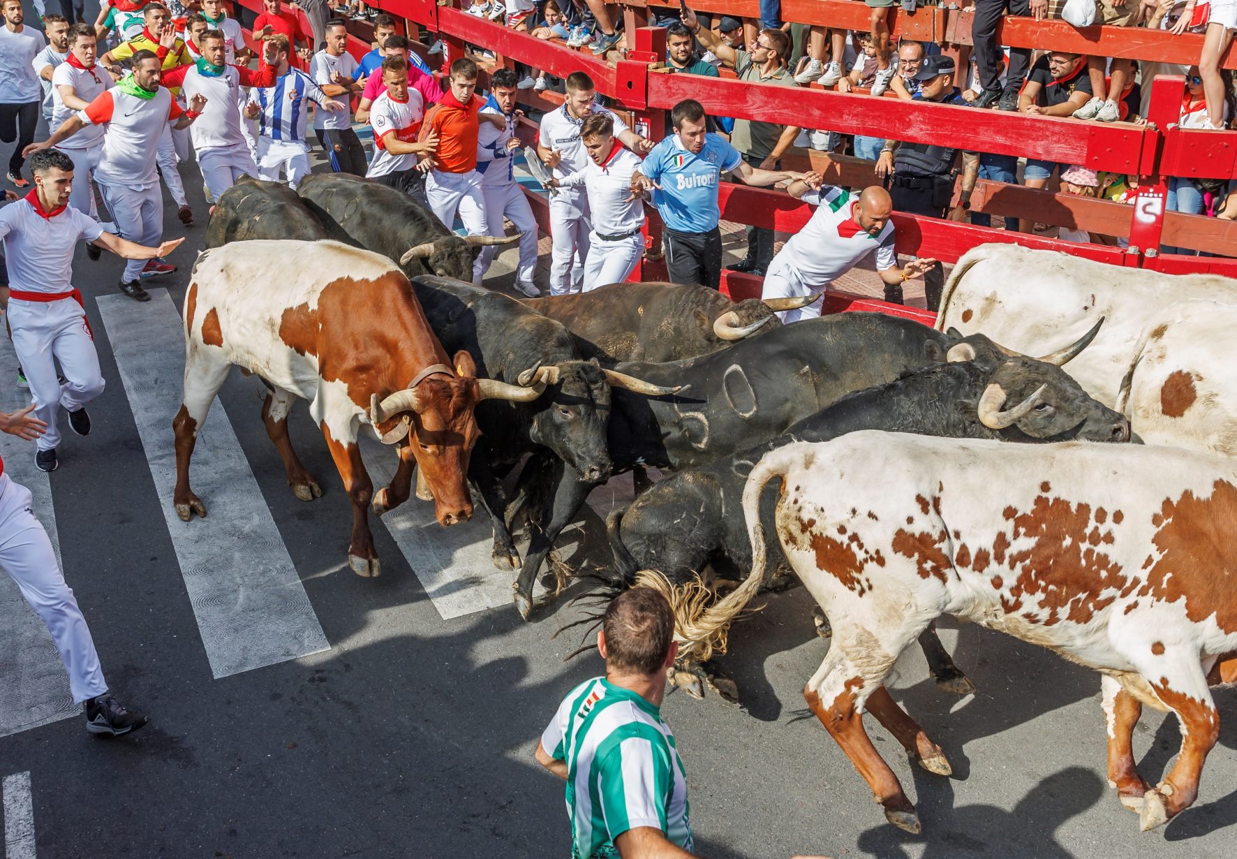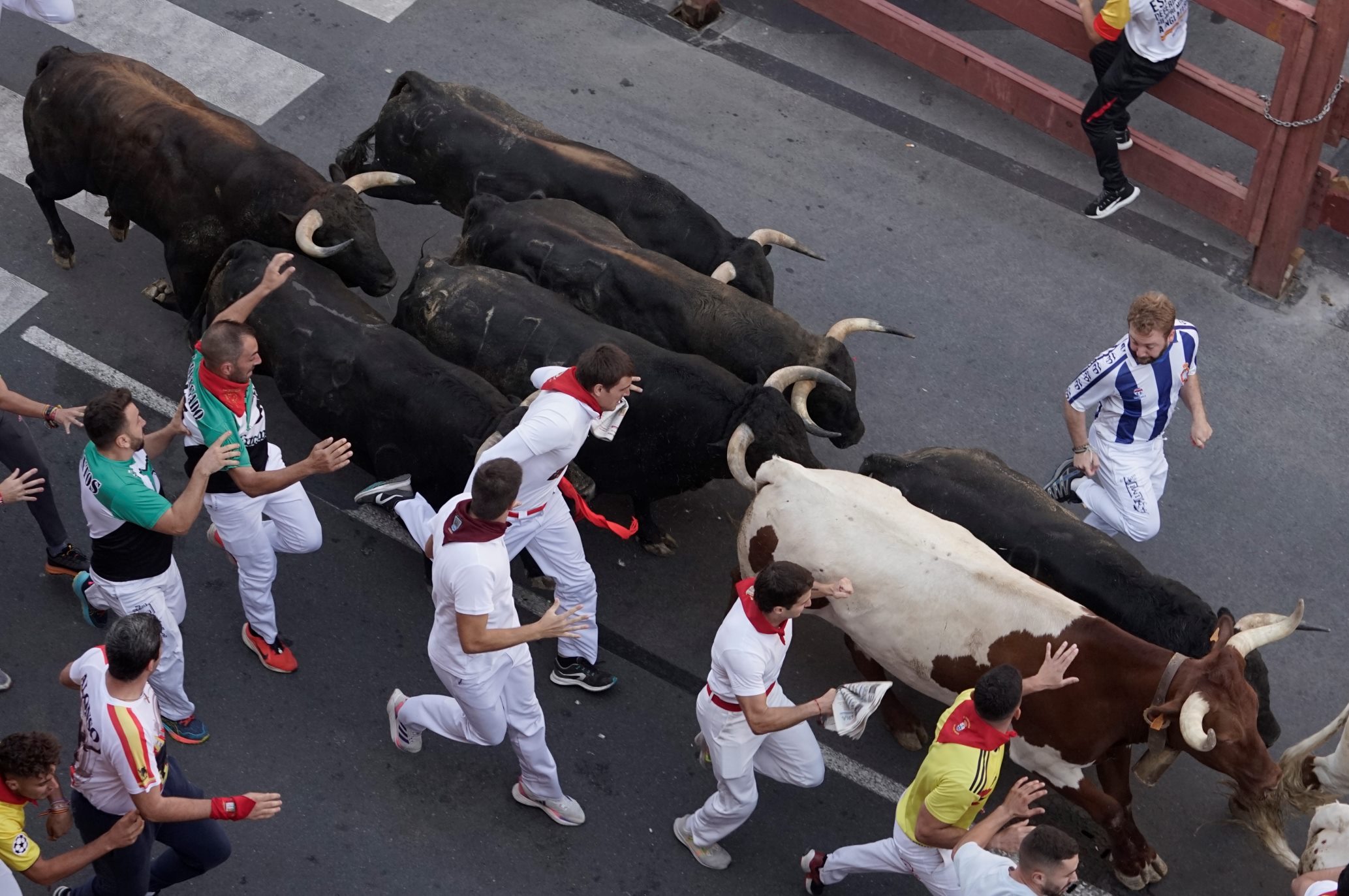 Con una duración de 1:42 en la calle y 2:37 hasta chiqueros, el encierro de hoy ha sido el más templado de la semana, con astados de la ganadería de Hermanos García Jiménez que han permanecido hermanados en la mayor parte del recorrido.