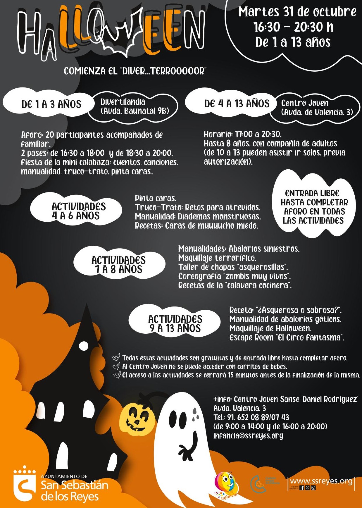 De 7 a 8 años: manualidades de abalorios siniestros, maquillaje terrorífico, taller de chapas “asquerosillas”, coreografía de “zombis muy vivos”, recetas de la “calavera cocinera”.