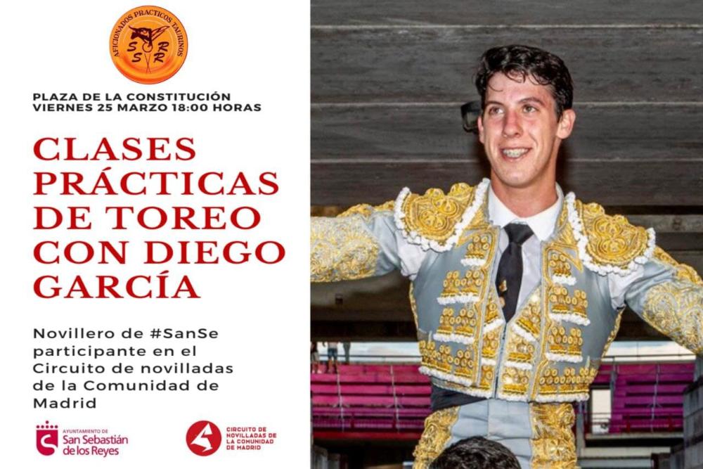El próximo viernes 25 de marzo la plaza de la Constitución acogerá las clases de toreo a cargo del novillero local Diego García. Este evento, organizado por la Asociación de Aficionados Prácticos Taurinos de la localidad y con la colaboración de la Delegación de Festejos del Ayuntamiento, es uno de los distintos actos que se incluyen dentro de la programación del Circuito de Novilladas de la Comunidad de Madrid para esta temporada.