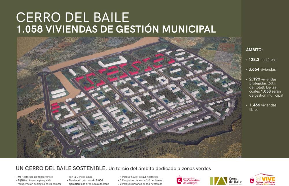 De este modo, las 128,3 hectáreas del ámbito urbanístico de Cerro del Baile acogerán un total de 3.664 viviendas, de las cuales 2.198 serán protegidas -en las que se encuadran las 1.058 anunciadas en régimen de compra o alquiler- y 1.466 serán libres.