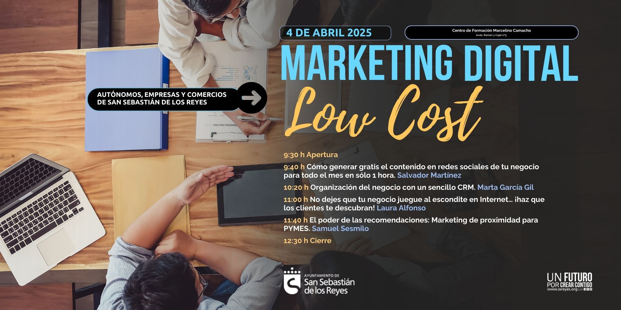 “Marketing Digital Low Cost” es la nueva propuesta gratuita de la Concejalía de Innovación, Comercio y Empleo, que tiene como propósito explorar y aprender sobre herramientas digitales de marketing que faciliten la presencia en Internet, simplifiquen los procesos y ayuden en la gestión del negocio, de una forma sencilla y con mínimos o inexistentes costes.