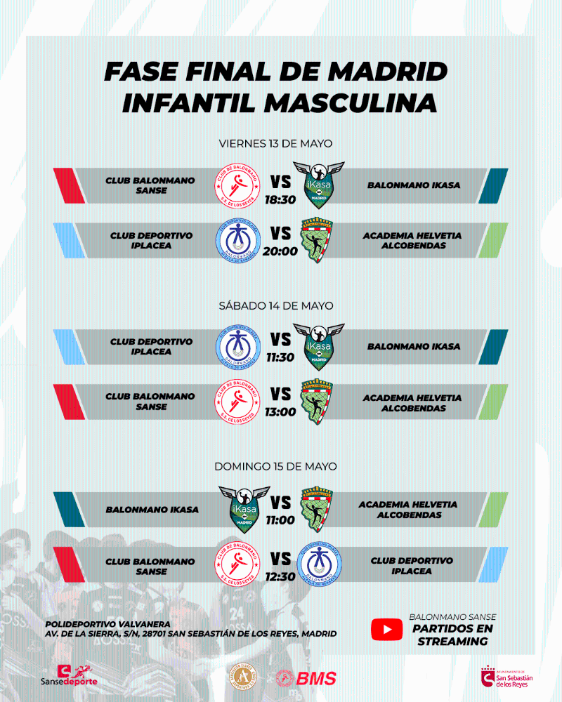 - El Balonmano Sanse se disputa el título de liga en la Fase Final de Madrid de categoría Infantil Masculina en San Sebastián de los Reyes y Femenina en Torrejón de Ardoz, durante los días 13, 14 y 15 de mayo.