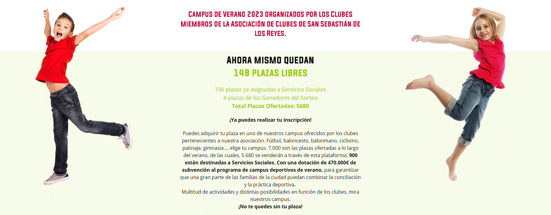 La Asociación de Clubes Deportivos de San Sebastián de los Reyes (ACDSSRR) abrió el plazo de inscripción para los campus predeportivos de verano ayer miércoles, 3 de mayo. En solo unas horas, la web de la Asociación ha tramitado más de 5.500 plazas, “lo que demuestra”, afirma la Asociación, “el interés que despierta el mayor programa de conciliación familiar del verano en la ciudad. Desde la ACDSSRR”, prosigue la Asociación, “se trabaja para ofrecer un abanico de actividades deportivas para los niños y jóvenes del municipio durante el periodo estival”.