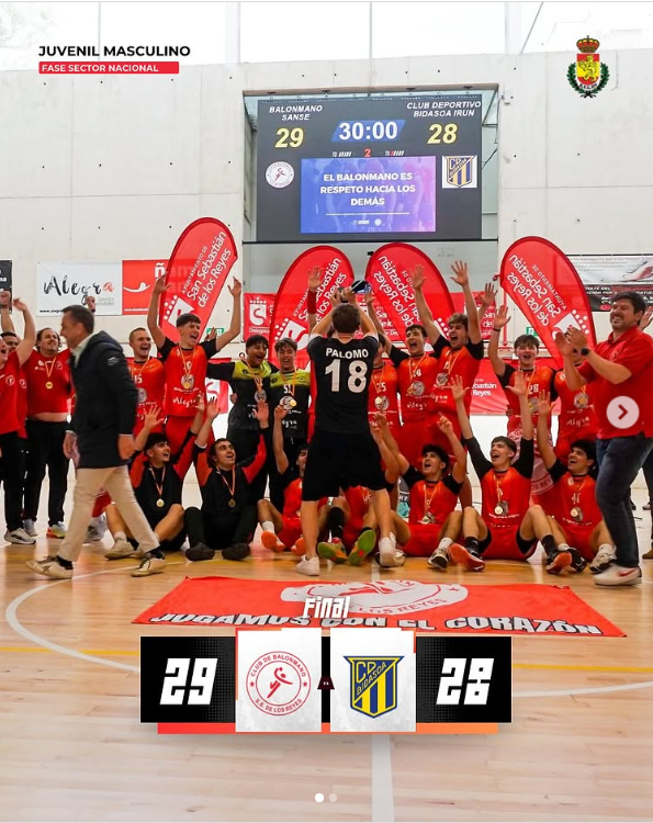 El equipo Juvenil Masculino del Club Balonmano Sanse se ha proclamado campeón de la Fase Sector Nacional Juvenil Masculino, celebrada en nuestra ciudad. Han conseguido esta victoria enfrentándose al equipo Bidasoa Irún, tras un partido muy igualado, ganando por solo un gol de diferencia. Con este resultado, han sellado su pase al Campeonato de España, situando a San Sebastián de los Reyes entre la élite del balonmano juvenil nacional.