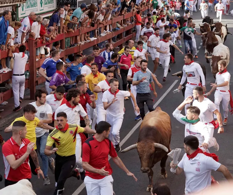 El encierro de hoy ha sido rápido, pero templado, con una manada compactada en gran parte del recorrido y con un toro que ha ido por delante, a trote constante, que ha brindado carreras largas y espectaculares.