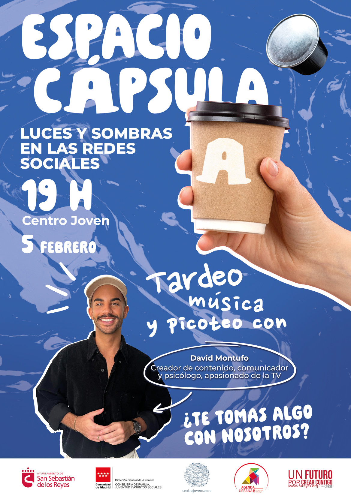 Se ofertará una `Cápsula´ al mes, los jueves de 19 a 20 horas, en un contexto de ocio acompañado de música y picoteo, con acceso libre y gratuito. El primer tardeo del Espacio Cápsula -“Luces y Sombras en las redes sociales”-, con David Montufo, será a las 19:00 horas del 5 de febrero.