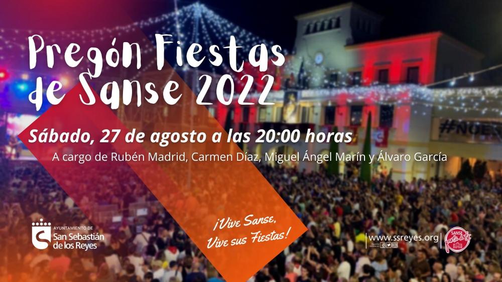 Mañana, 27 de agosto, a las 20.00 horas, el pregón oficial dará inicio a las fiestas. Desde el balcón del consistorio los pregoneros Rubén Madrid (cantante), Carmen Díaz (escritora), Miguel Ángel Marín (deportista) y Álvaro García (torero), vecinos de Sanse que representan a diferentes ámbitos de la vida local, darán el pistoletazo de salida a nueve días de fiestas en los que habrá lugar para todo tipo de actividades.