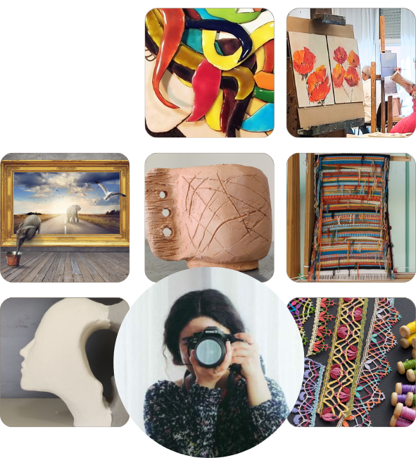 Muestra de los trabajos realizados por los participantes de los Talleres Municipales de pintura, cerámica, escultura, talla de madera, restauración, bolillos, bordados, esmaltes, tapices, fotografía y photoshop.