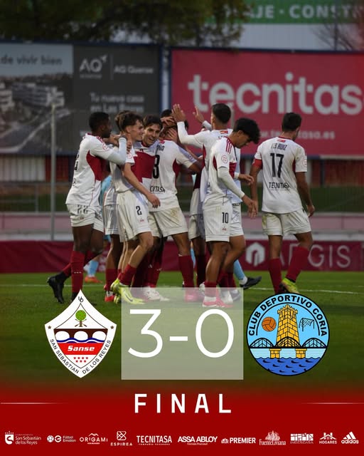 La Unión Deportiva Sanse se impuso frente al Club Deportivo Coria, con un contundente 3-0 que lo sitúa tercero de la clasificación.